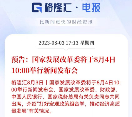 引爆点之一,是今天发改委官宣的一则新闻:8月4日10点,也就是明天,将举行一场以介绍“打好宏观政策组合拳,推动经济高质量发展”有关情况的新闻发布。
