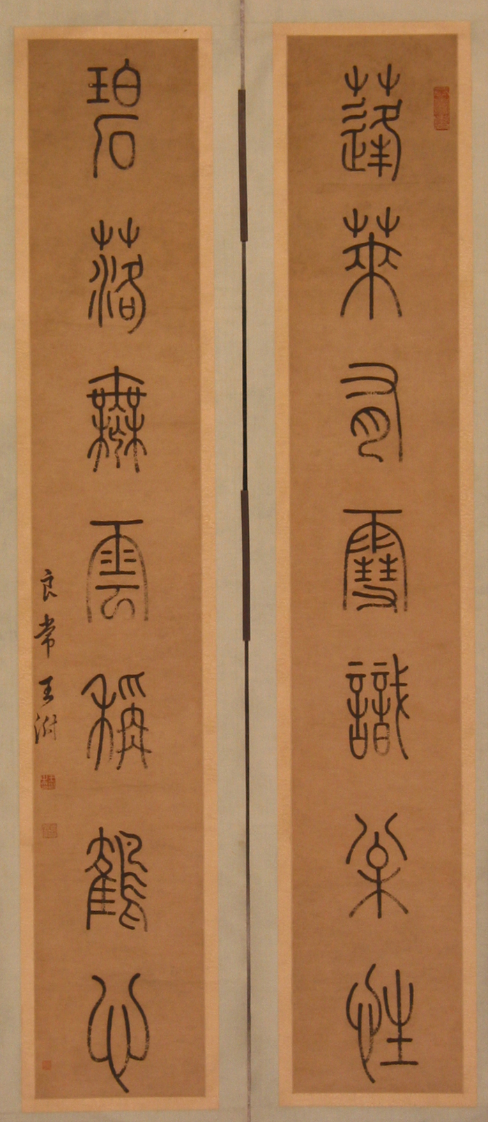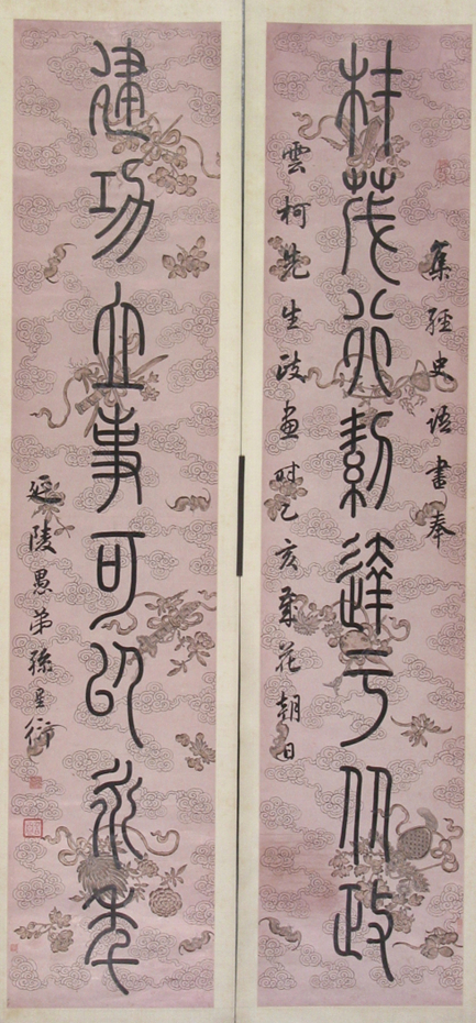 本单元展出了清代篆书“复古”阶段代表书家王澍的作品“篆书七言联”,其句为:“蓬莱有雪识松性,碧落无云称鹤心。”署款“良常王澍”,钤印“王澍之印”白文印、“虚舟”朱文印、“恭寿老人”长方印。此作品结字匀称端庄,法度分明,笔力内凝,圆润婉转。