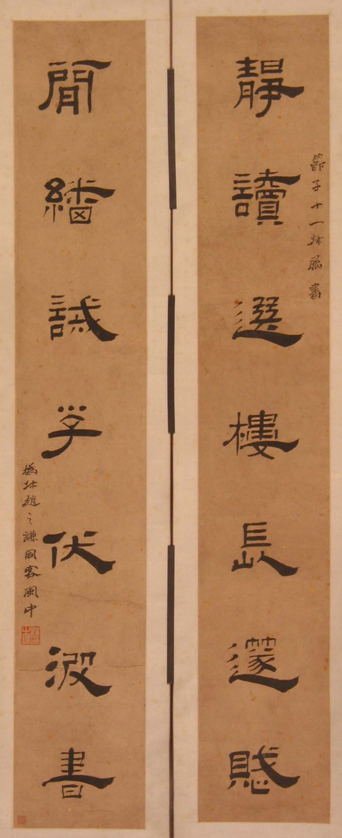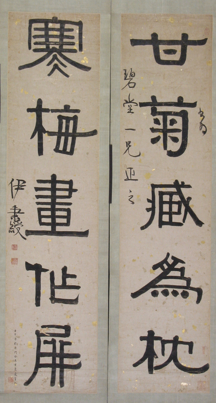 在展览第二单元展出了篆隶中兴先驱代表——伊秉绶的作品“隶书五言联”,集中展示了清代学术风气的转变对隶书复兴的促进作用。伊秉绶的隶书风格是在广泛吸取汉代砖瓦铭文、隶书碑刻等基础之上形成的。在精准领悟汉隶特征同时,伊秉绶准确把握汉碑敦厚古朴的艺术特点,加入个人理解,形成其“融颜入隶”的独特风格,舒缓平淡的同时不失大气雍容,与书法大家赵孟頫、董其昌书风形成鲜明对比。本单元展出其隶书五言联:“甘菊藏为枕,寒梅画作屏。”署款“书为碧堂一兄正之。伊秉绶。壬午得于吴门,癸未重装蘧庵记。”钤印“西湖长”白文方印、“伊秉绶印”朱文方印、“柘湖”朱文椭圆印、“留研草堂”朱文长方印、“何氏有元四家书楼之印”朱文方印。此作品隶书个性鲜明,圆韧波磔。章法亦具特色,立意古拙,直追秦汉。