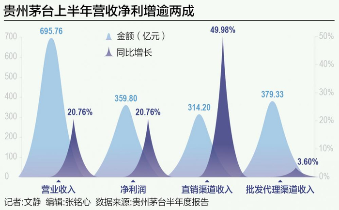 8月2日,贵州茅台发布的业绩报告显示,上半年,该公司实现营收695.7亿元,同比增长20.8%,实现归属于上市公司股东的净利润为360亿元,同比增长20.8%,增速均超过之前该公司的初步核算。