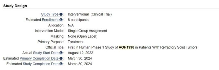 在上述积极结果的背景下,希望城市现已开展1期临床试验。根据 ClinicalTrials.gov公布的信息,该试验已经在2022年8月开始,主要临床终点是确定AOH1996的最大耐受剂量(MTD)和剂量限制性毒性(DLT),针对的患者群体是对治疗无反应(难治性)的实体瘤患者,预计入组人数8名,预计研究完成时间是2024年3月30日。
