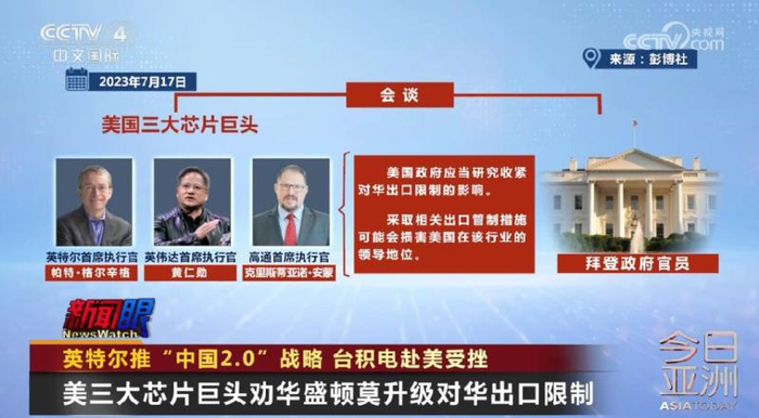 另据彭博社披露,7月17日,美国三大芯片巨头的首席执行官——英特尔的帕特·格尔辛格、英伟达的黄仁勋和高通的克里斯蒂亚诺·安蒙在与拜登政府官员举行会谈时表示,美国政府应当研究收紧对华出口限制的影响。三位CEO警告说,采取相关出口管制措施可能会损害美国在该行业的领导地位。