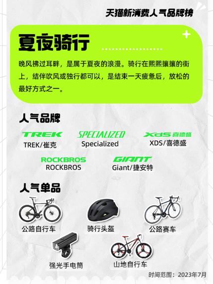晚风拂过耳畔,是属于夏夜的浪漫。夜骑可能是很多人结束一天疲惫后,放松的最好方式之一。在天猫上,崔克、Specialized这两家历史悠久的国际品牌让装备党为之心动,他们推出的减震山地自行车和公路竞赛自行车分别拿下了细分类目榜单的第一。“帅”,是评论区最多的字眼,一辆高颜值的自行车满足了不少男生的青春梦。喜德盛、ROCKBROS、捷安特等中国品牌也紧跟其后,为了吸引年轻人注意,还发布了自行车、童车、骑行头盔等多款新品。
