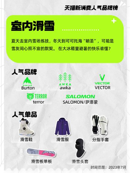 大冰箱里避暑的快乐谁懂?高温天来了,滑雪爱好者集体躲进了室内滑雪场。装备不能输:滑雪鞋、滑雪服、分指手套、滑雪板单板、滑雪头套,成了人气单品。在天猫上,7月份30多个品牌滑雪装备销售额增长翻倍,跻身前5名的品牌是Burton、AWKA、VECTOR、terror、萨洛蒙。