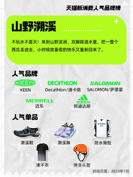 不玩水不夏天,来到山野溪涧,双脚踩进水里,把一整个西瓜丢进去,小时候放暑假的快乐又重新回来了。在溯溪装备里,KEEN、迪卡侬、萨洛蒙、迈乐、阿迪达斯等国际品牌更受到偏爱。