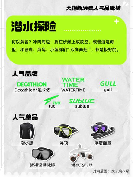 当然,夏天最极致的快乐也许是冲向海边了。躺在沙滩上放放空,或者潜进海里,和珊瑚、海龟、小鱼群们”双向奔赴“。在潜水这个新兴行业,WATERTIME、gull、tuo、sublue等国内品牌崛起,紧跟大牌迪卡侬之后。品牌们在天猫纷纷推出潜水服、泳镜、浮潜面罩、近视深潜泳镜、潜水飞行器等新品。