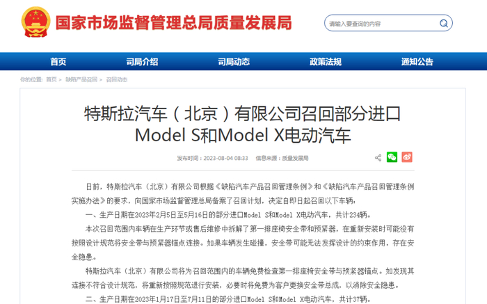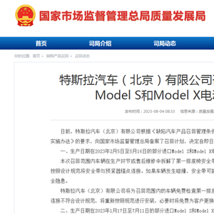 据国家市场监管总局网站4日消息,日前,特斯拉汽车(北京)有限公司根据《缺陷汽车产品召回管理条例》和《缺陷汽车产品召回管理条例实施办法》的要求,向国家市场监督管理总局备案了召回计划,决定自即日起召回以下车辆: