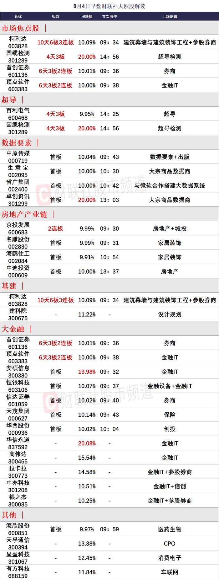 财联社8月4日讯,今日19股涨停,25股炸板,封板率为43%,柯利达3连板,京投发展2连板,国缆检测、百利电气4天3板,首创证券、顶点软件6天3板,中原传媒、名雕股份5天2板,安硕信息、卓创资讯20CM首板。盘面上,收涨个股2194只,收跌个股2658只;板块方面,超导概念、算力租赁、数据要素、信创等板块涨幅居前,食品加工、CRO、服装家纺、养殖等板块跌幅居前。