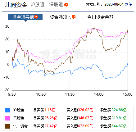 北向资金全天净买入27.42亿元,其中沪股通净买入1.16亿元,深股通净买入26.26亿元。