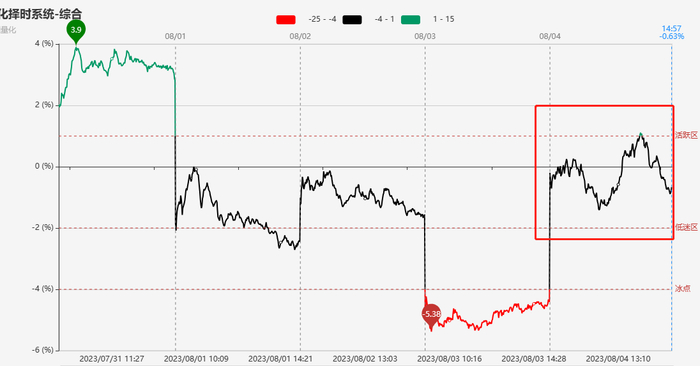 指标显示,市场短线情绪开盘大幅回升至0轴附近后,全天大部分时间围绕0轴附近展开宽幅震荡。午后大金融板块再度爆发推高短线情绪冲高至活跃区附近后,尾盘金融股出现快速回落,拖累短线情绪再度掉头向下报收于0轴下方。