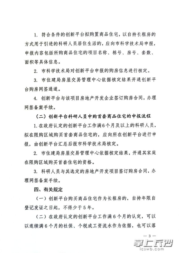 长沙晚报掌上长沙8月4日讯(全媒体记者 陈焕明)4日,长沙市住房和城乡建设局、长沙市科学技术局联合印发《关于全力建设全球研发中心城市满足科研人员住房需求实施细则》(以下简称《实施细则》),对政策实施范围、申报流程等进行了规定,其中明确,允许符合条件的创新平台以企业自持长租房的方式,购置商品住宅用于引进科研人员居住生活;在政府认定的创新平台工作满6个月及以上的科研人员,可在限购区购买首套商品住宅。