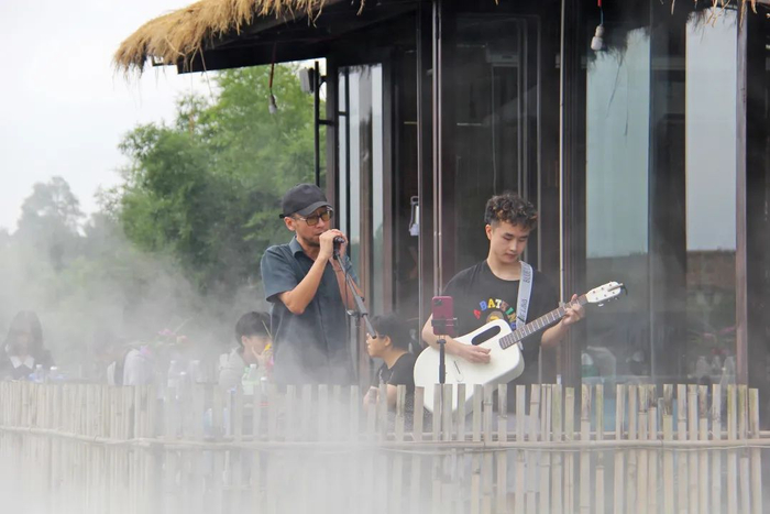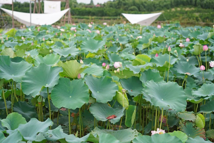 随后,沿着溪水潺潺的凉山渠,大家走上绿道,穿过郁郁葱葱的竹林、茶园,一大片荷塘呈现在大家眼前,荷塘烟雾缭绕,荷花次第开放,空气清新宜人,荷塘边的小酒馆歌声轻盈,浪漫而令人心旷神怡的景色引得大家驻足观看打卡。