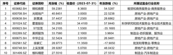 2023年7月,上海上市公司涨幅排名前10位的股票中,房地产业占据5席,制造业占据2席,租赁和商务服务业、科学研究与专业技术服务业、批发和零售业各占据1席,涨幅最大的是锦和商管,上涨59.24%;其次是光明地产,上涨40.85%。
