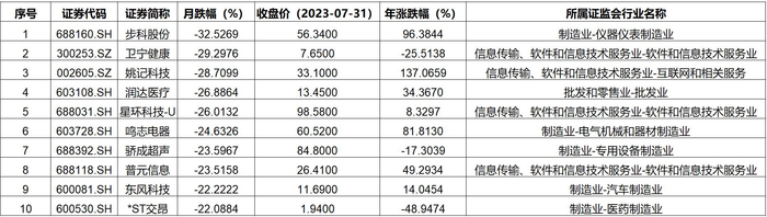 上海上市公司7月跌幅TOP10
