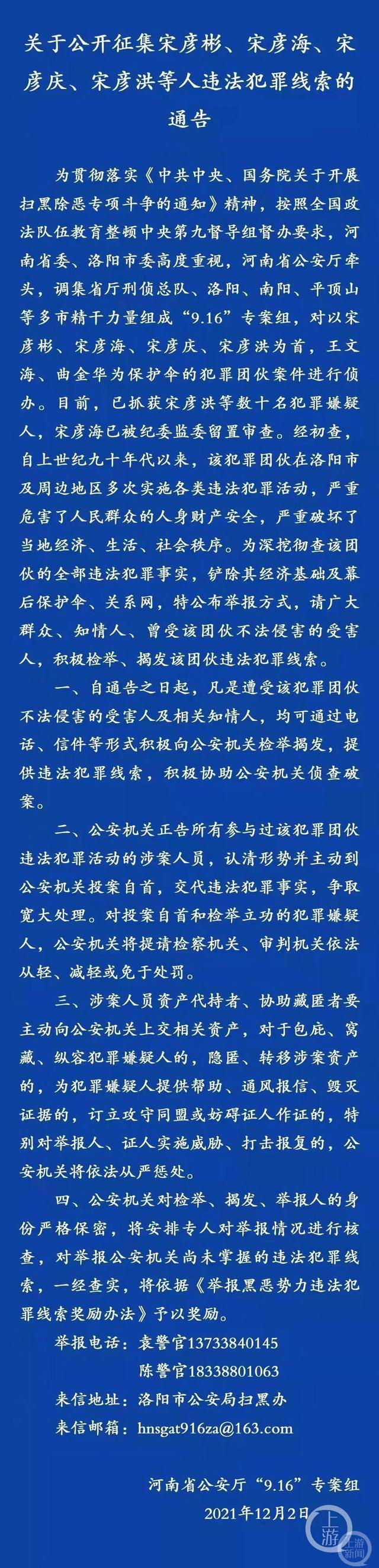 ▲2021年12月2日,河南省洛阳市公安局官方微信“平安洛阳”发布通告,公开征集宋彦彬、宋彦海、宋彦庆、宋彦洪等人违法犯罪线索。图片来源/平安洛阳