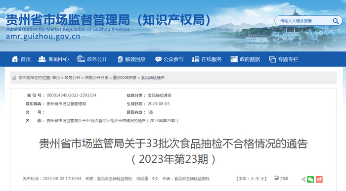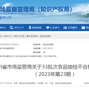 贵州省市场监管局关于33批次食品抽检不合格情况的通告(2023年第23期)