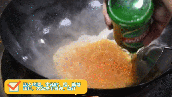 4.锅内热油,爆香葱姜蒜,加入花椒,辣椒粉,啤酒、、盐,倒入小龙虾,大火煮10分钟,收汁