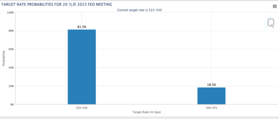 美联储利率观察工具Fedwatch显示,市场认为美联储9月继续加息的概率不到20%。