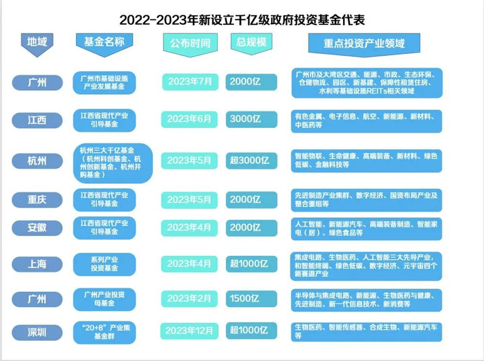 其实千亿级产业基金集群并不罕见,2022年下半年以来,就有深圳、上海、广州等地均设立相关基金集群。进入2023年,安徽、江西、上海、广州、重庆、杭州等多个省市纷纷宣布设立千亿规模的政府投资基金,进一步优化整合当地资源,通过基金集群带动支持当地特色产业集群发展。