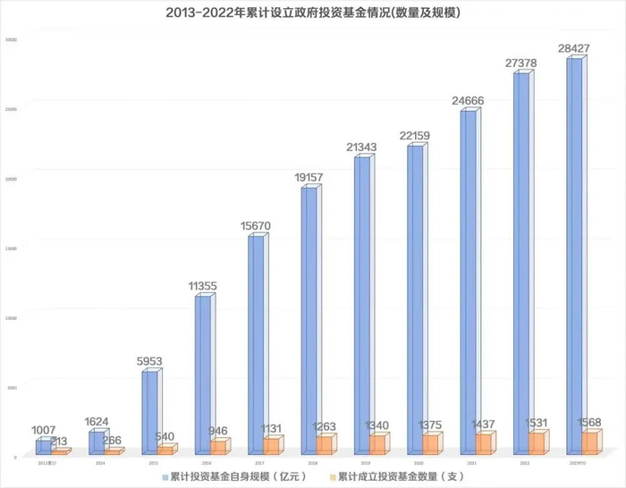 平均来看,从2013到2022年的过去十年间,政府投资基金数量增加1318只,CAGR(复合年均增长率)为24.50%;政府投资基金自身规模增加26371亿元,CAGR为44.34%。