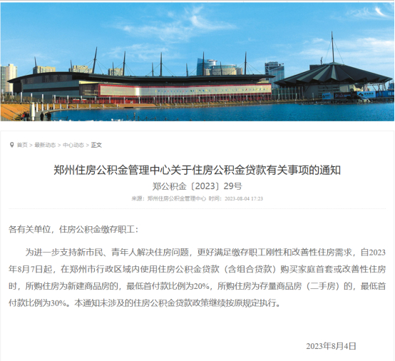据4日晚间郑州住房公积金管理中心发布的通知,为进一步支持新市民、青年人解决住房问题,更好满足缴存职工刚性和改善性住房需求,自2023年8月7日起,在郑州市行政区域内使用住房公积金贷款(含组合贷款)购买家庭首套或改善性住房时,所购住房为新建商品房的,最低首付款比例为20%,所购住房为存量商品房(二手房)的,最低首付款比例为30%。