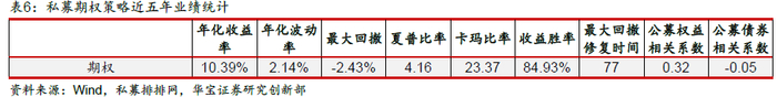 从历史业绩来看,期权策略作为绝对收益策略,过去五年年化收益10.39%,大部分时间都收益平稳,局部的最大回撤显示出了黑天鹅事件对卖权为主的期权策略的潜在冲击,不过随着风险意识的提高和策略的完善,近些年来期权策略净值的不平滑程度有所减少。期权策略也与公募债券类资产呈现了很低的相关性,体现了作为一种类固收策略,改善组合收益表现的可能。