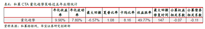 从业绩统计可以看出量化趋势并不是一个高胜率的策略,但是通过抓住行情上大的机会,平均年化收益达到9.90%,最大回撤约6.57%。量化趋势策略与公募权益和债券资产呈现微弱的负相关性,这也是CTA策略过去被称为“危机Alpha”的原因。量化趋势策略在过去一年业绩表现较为惨淡,也受到了许多质疑,不过CTA策略的业绩有明显的周期性,经历长期低迷后业绩有望转暖,而且即使从资产相关性出发,CTA趋势策略仍具备一定配置价值。