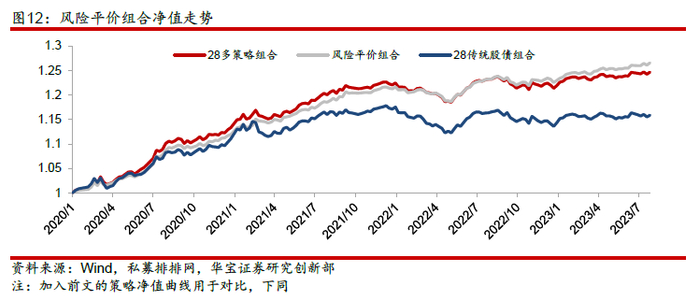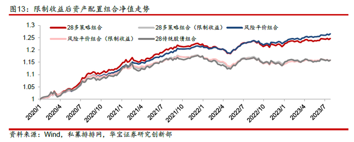 相比收益率,对于波动率的预测更加稳定。平衡组合内资产的风险贡献,以穿越牛熊获取平稳的长期收益,这构成了全天候策略的基本思想。但是风险平价的弊端在于会放大低波动产品的比重,因此文本的风险平价模型在2:8的框架内部运行,对高风险类资产和低风险类资产分别利用风险平价计算仓位,考虑私募策略的容量限制,将私募策略的权重上限设置为固定权重组合的两倍。利用过去1年的历史数据计算组合波动率,每年6月、12月进行调仓,风险平价组合业绩表现如下,可以发现风险平价组合在多策略组合的基础上表现又有所提高,年化收益达到6.85%,最大回撤仅为2.43%,而且尤其适应2022年下半年以来的震荡行情,净值不断创出新高。