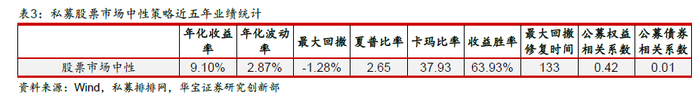 从历史业绩来看,股票市场中性策略由于需要付出额外的对冲仓位和成本,在平均收益上不及指数增强策略的超额水平,近五年平均年化为9.10%,最大回撤1.28%,作为绝对收益型策略,收益比较稳健。由于股票市场中性策略从股票多头出发,因此与公募权益资产表现出了一定的相关性,但是与公募债券类资产相关性很小。