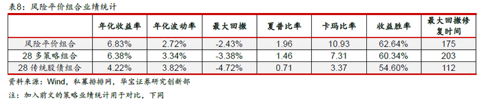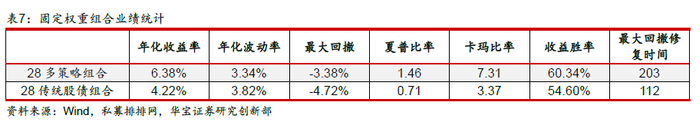 20%股票和80%债券是常见的高风险资产与低风险资产的配置方式,我们延用这一设定,传统股债组合仅投资万得偏股混合型基金指数和万得中长期纯债型基金指数,多策略组合在此基础上增加了前文介绍的5类私募策略。综合考虑各策略的容量和风险特征进行均衡配置,从2020年开始传统股债组合和多策略组合的业绩表现如下,可以发现除最大回撤修复时间之外,多策略组合在各项收益指标上相较传统股债组合都有所改善。