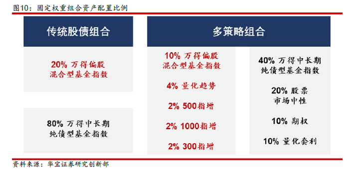 为了模拟加入私募策略后资产组合的收益风险改善情况,我们首先需要对私募策略贡献的真实收益进行还原,因为私募策略相较公募会扣除20%左右的后端费用。后端费用一般情况下按绝对收益计提,具备明确基准的策略如指数增强按照超额收益计提。由于超额收益的计提会受到买卖点的影响,例如按绝对收益计提后端费用的策略净值如果经历大幅回撤和反弹,若从开始持有至结束,此时收益未回正则无需付出后端费用,但若在低点卖出再买入,同样经历了完整的行情,则需要付出上涨阶段的后端费用,这种特性导致了我们难以对私募策略指数进行通用的还原,在上一节中所展示的策略净值均为未扣除后端费用的结果,所幸私募策略过去几年相比公募股债的收益优势较为明显,后端费用的差异不会改变相关定性结论。
