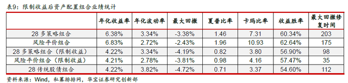 我们把指数增强和量化趋势策略的收益对标万得偏股混合型基金指数,把量化套利、期权、股票市场中性策略的收益对标万得中长期纯债型基金指数,在各自周度收益的基础上加上一个固定值,将投资始末的收益与对标指数调整至一致,同时保持本身的风险特征以及对组合的风险贡献不变。在限制收益率之后,单纯从收益来源的差异性出发,资产组合的业绩表现如下。可以发现虽然加入私募策略对持有期的收益率影响不大,但是无论是固定权重组合还是风险平价组合,相比传统股债组合都可以显著改善风险以及收益风险比,提升持有体验,而且风险平价组合相比固定权重组合再次展现出了一定优势。