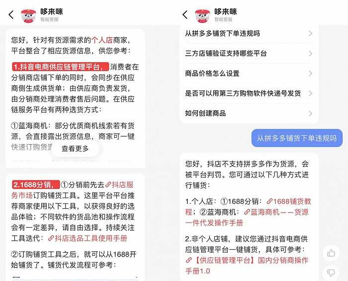 针对没有货源的个人店商家,抖音推出两个货源平台:抖音电商供应链服务平台和1688平台。不过有商家反映,当前抖音电商供应链服务平台上的商品种类不够丰富、价格也偏高,1688、淘特、拼多多是抖音平台无货源商家较为常用的拿货渠道。目前抖音已经明令禁止拼多多作为店铺货源。