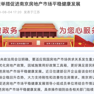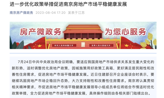 8月4日下午5时20分,据南京市微政务官微,南京市发文《进一步优化政策举措促进南京房地产市场平稳健康发展》,给出了8条政策,涉及购房补贴、房票安置、建立“安置房源超市”、优化车位车库销售审批手续、提升预售监管资金使用效率等。