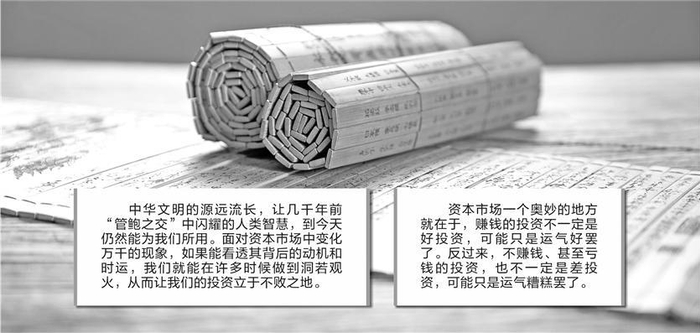 语到文末,感谢中华文明的源远流长,让几千年前“管鲍之交”中闪耀的人类智慧,到今天仍然能为我们所用。面对资本市场中变化万千的现象,如果能看透其背后的动机和时运,我们就能在许多时候做到洞若观火,从而让我们的投资立于不败之地。
