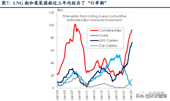 量的提升:造船市场新订单已于 2020 年开始上升,2022 年新订单量远高于 2020 年,2023 年新签订单量保持稳健增长。2008 年金融危机之后,因为订单惯性,新造船 订单仍在一定时间内维持高位,后经历了较长时间的持续下滑,至到 2020 年行业新造 船订单开始快速上升。2022 年,新造船市场订单量达到高位,且造船新签订单量(周度 累计)远高于 2020 年。2023 年,新造船市场订单量相较 2022 年略有下滑,但增长仍比 较稳健。