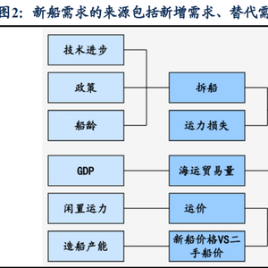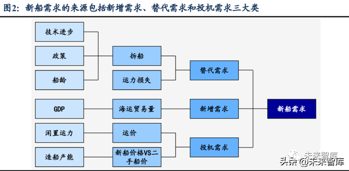 造船需求既跟随航运贸易波动,也受船舶本身到龄更新替换等因素影响,相应地, 新船需求包括新增需求、替代需求和投机需求三大类。其中,新增需求主要取决于航运 需求,替代需求由技术进步、环保政策和船舶到龄更新共同决定,投机需求受运价、新 船价格与二手船价对比的共同影响。