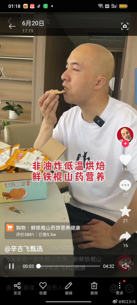 “在网络上以食品安全为主题演讲的短视频博主辛吉飞,在抖音上以辛吉飞官方甄选和辛吉飞直播精选;向消费者推荐的七个产品居然涉假,还有其他产品也涉假。目前正在检测中。”