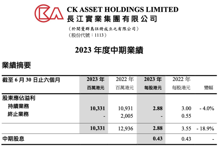 中报显示,截至2023年6月30日,长江实业集团未经审核的持续业务股东应占溢利为103亿港元,同比减少20.14%;每股盈利2.88港元,同比下滑18.9%;每股中期股息0.43港元。