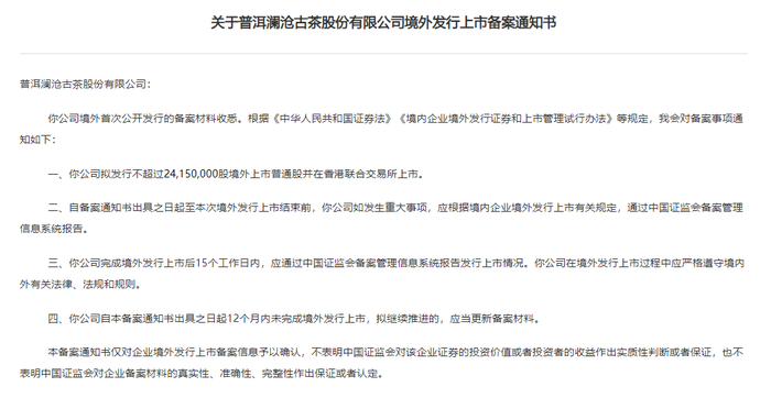8月2日,据证监会备案通知书,澜沧古茶目前已完成赴港上市备案,拟发行2415万股境外上市普通股并在港交所上市。