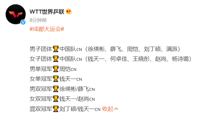 成都大运会:周恺夺男乒单打冠军,国乒包揽全部金牌