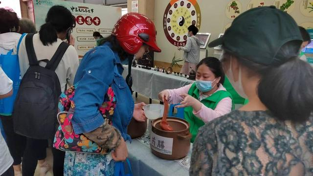 同样排着队的还有药膳摊位,刚配好药的徐阿姨一边品尝着,一边询问这款药膳的名称和做法。“这款叫四味调神汤,是一款中医食疗汤谱,能调养脾胃、润肺降噪,汤里不仅有小排还有四味药材芡实、茯苓、淮山、薏仁,很适合这个季节食用。”志愿者为徐阿姨介绍。