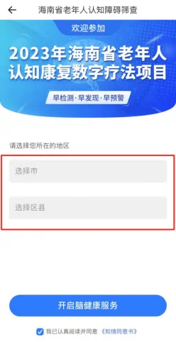 点击2023年海南省老年人认知康复数字疗法,经过市县选择后进入到训练页面。
