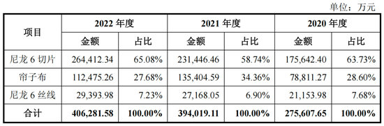 尼龙6切片产品是生产尼龙6丝线产品、尼龙6帘子布产品的主要半成品,受产品平均单价上涨、跨国客户的销量增长,2021年和2022年6切片产品销售收入同比分别增长31.77%和14.24%。报告期内销售收入分别为17.56亿元、23.14亿元、26.44亿元,占主营业务收入的 63.73%、58.74%、65.08%。