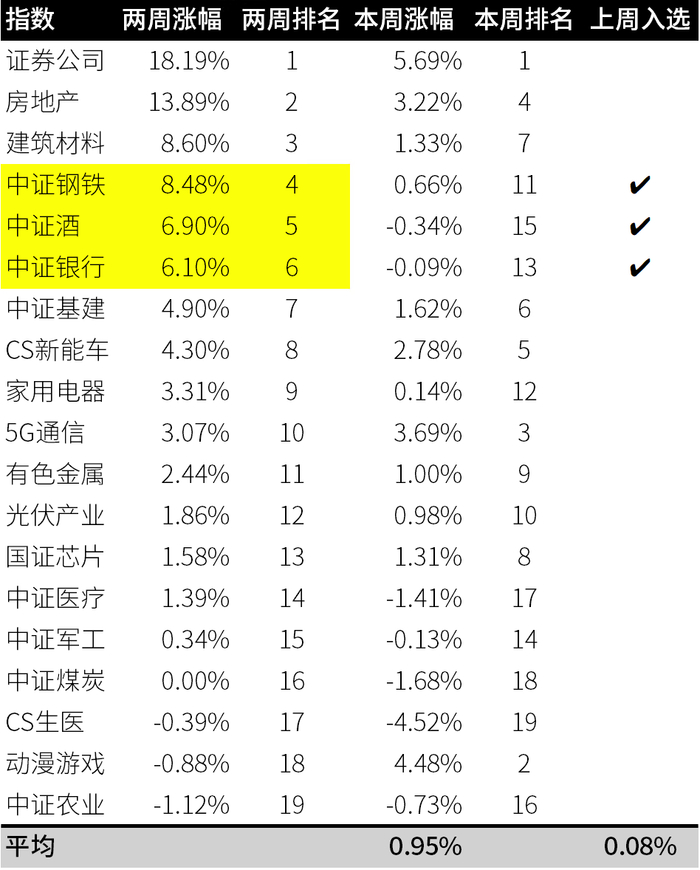 上周关注的酒、银行、钢铁本周平均上涨 0.08%,相对 19 个行业平均 0.95%的涨幅,轻微跑输。下周依然将关注这三个行业。