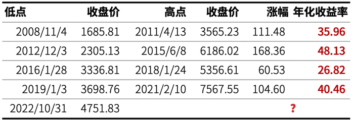 不过从下表统计可以看到,从底部到顶部,涨幅动辄 60%+,甚至 100%+是常态,所以笔者之前说的底部区域三年一倍的收益潜力,也是被历史数据所支撑的。