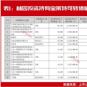 7月28日,宝莱特发布了中报,此外,其同步披露了报告期末前十名可转债的持有人情况,具体来看,林园投资227号基金、林园投资恒泰精选1号基金、林园投资228号基金以及林园投资200号基金等均现身持仓。其中,林园投资227号基金持有数量较多为47630张,持有可转债金额为476万元,其它基金持有可转债金额也均在300万元以上(见表1)。