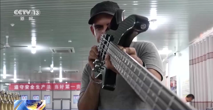 制作一把电吉他,最后一关是调音,这也是技术含量最高的工序。这家企业有3个调音师,李庆生就是当地土生土长的村民,他接触这个行业5年后就成为了调音师。