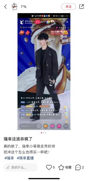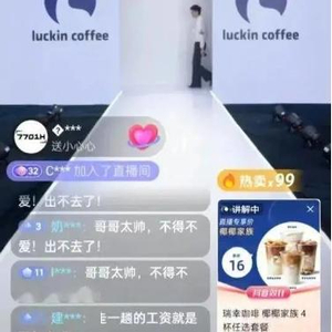 此前,瑞幸在抖音的直播间,一改往日主播直播风格,取而代之的是一大波身材高大、颜值在线的男模。直播画面显示,男模们整体服装以黑白灰为主,脸颊上印着瑞幸的 LOGO ,人手拿着一杯咖啡。不同造型的模特对应不同单品以及不同的说辞。