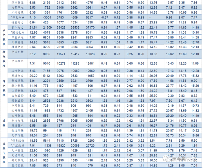 表1:公用事业行业主要公司估值表